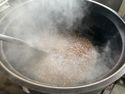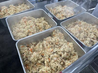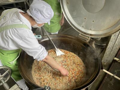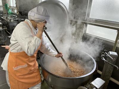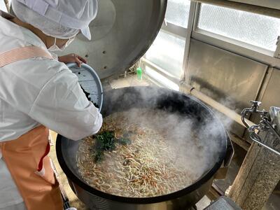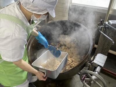 食缶に入れてからたれをかける方法もありますが、今回は全体にムラなく行きわたらせたかったため釜で和えて絡めました。