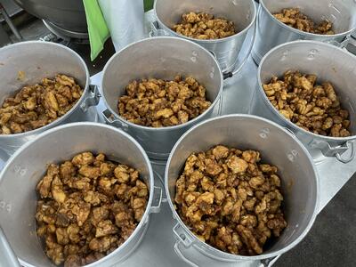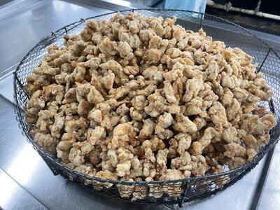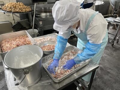今日は一口大のとり肉を43㎏納品して、にんにく、しょうが、酒をよくもみこんで下味をつけました。そのあと、片栗粉を全体にまぶし固まらないようにほぐしながら油で揚げていきます。揚げている間にねぎが入った甘酸っぱいたれを作ります。最後に揚がったとり肉をたれに絡めて完成です。おいしくいただきましょう。