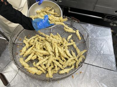 揚げ網に並べる際には異物などがないか確認しながら並べます。