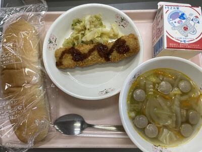 🎃コッペパン 🎃牛乳 🎃たちうおフライ 🎃キャベツのソテー 🎃ソーセージと白菜のスープ