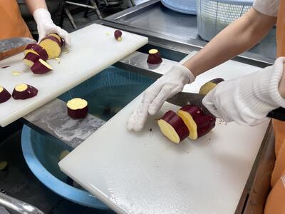 さつまいもは一度油で揚げて、最後に混ぜ合わせて作っています。
