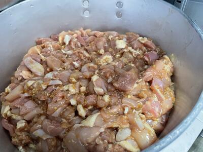 おこわに使用する鶏肉はしょうが、しょうゆ、酒で下味をつけます。