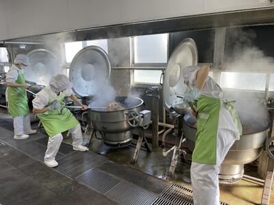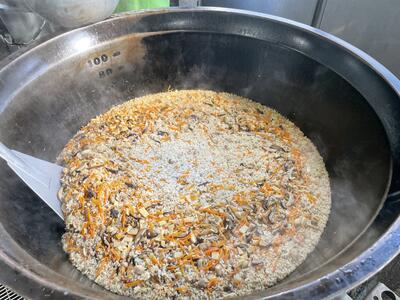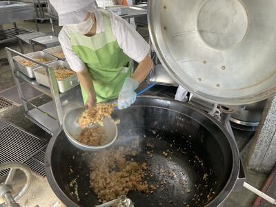 今日は給食室で炊いた「中華おこわ」です。ではここでおこわについてクイズです。