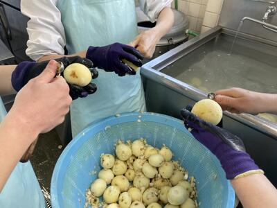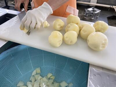 じゃがいもは球根皮むき機で皮をむいたあとに一つひとつ確認しながら芽や皮がむけていないところをえぐっていきます。