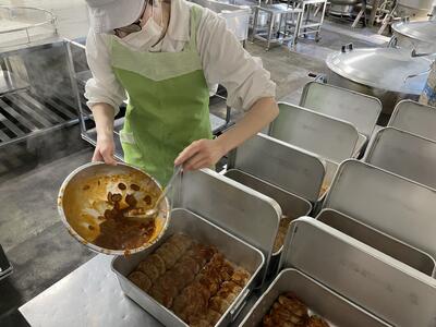 それを食缶に移し替えて、お玉でハンバーグの上に均等になるようかけていきます。