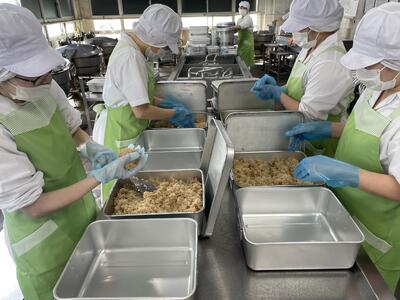 毎年1月24日~30日は全国学校給食週間です。この週間は学校給食の大切さや、食べ物を作る人への感謝、日本の食文化について学ぶための期間で、給食について考える大切な週間です。今週はその学校給食週間にちなんで特別メニューがたくさん登場します!今日は昔の給食を再現したおにぎり給食です。ご飯を学校で炊いたあと約750個のおにぎりを一つ一つ握りました。感謝しながらいただきましょう。