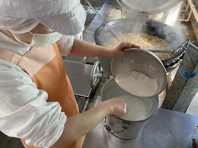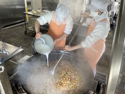 混ぜながら入れないと一部ゼリー状のようになってしまうので必ず二人一組で入れます!