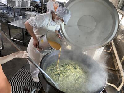 中華風コーンスープを作っている裏で下処理室で卵を1つずつ割っていきます。