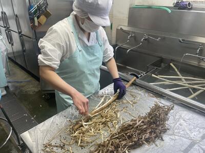 ごぼうはピーラーで皮をむき、洗います。