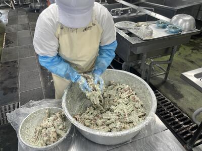 ちくわは小麦粉と水をあおさで硬めの衣を作り、たらいの中でよく和えて全体に衣がつくようにします。