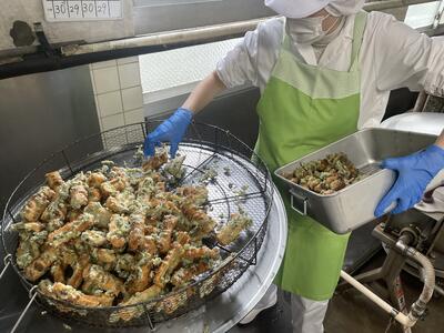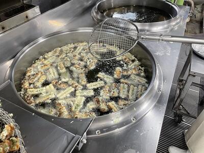 すくい網を使い、くっつかないようにしながらきつね色になるまで揚げていきます。