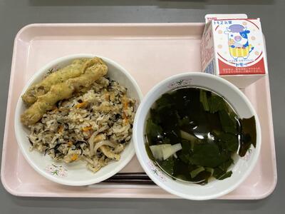🌸ひじきごはん 🌸牛乳 🌸ししゃもの天ぷら 🌸わかたけ汁